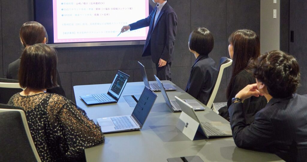 続いてこちらは大会議室。大人数で利用するときによく使われています。広々としていて大きなモニターもあるので、来客時にも利用する社員が多いです。