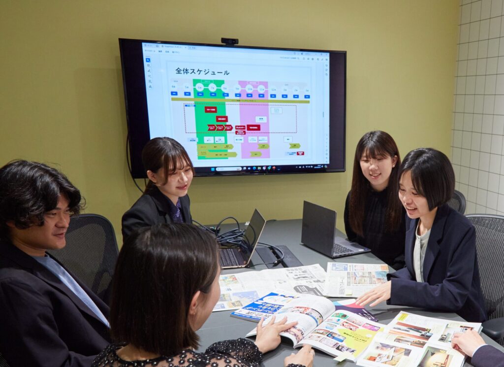 執務室内は、各部署・チームごとにエリアが分かれており、チーム内ではフリーアドレスになっています。各デスクにテレビが設置されているので、社員は働きながら常に情報収集し、トレンドをインプットしています。