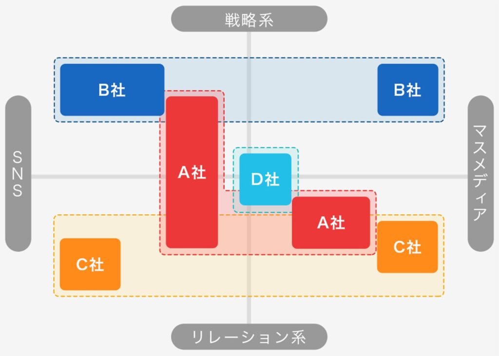 現在、PR業界は一口に説明しにくいほど、多様化しています。あえて縮図に落とし込むとなると、主に『戦略系・リレーション系』の違いと『媒体』のジャンルにわけられます。たとえば、戦略施策をWeb展開するPR会社もあれば、培ったリレーションを利用したマスメディア施策が得意なPR会社もあります。
