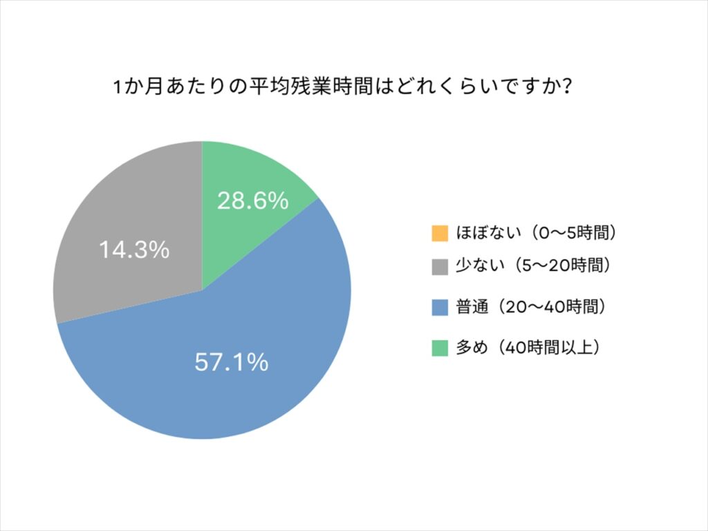 1か月あたりの平均残業時間について聞いたところ、半数以上が「普通(20〜40時間)」と回答しました。