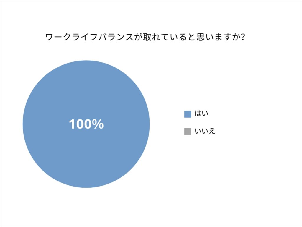 「ワークライフバランスが取れていると思いますか?」という質問に対し、全員が「はい」と回答。正直、出来すぎた結果にも見えますが、これがそのままのリアルな声です!