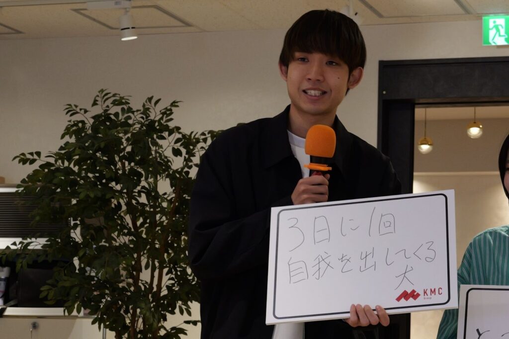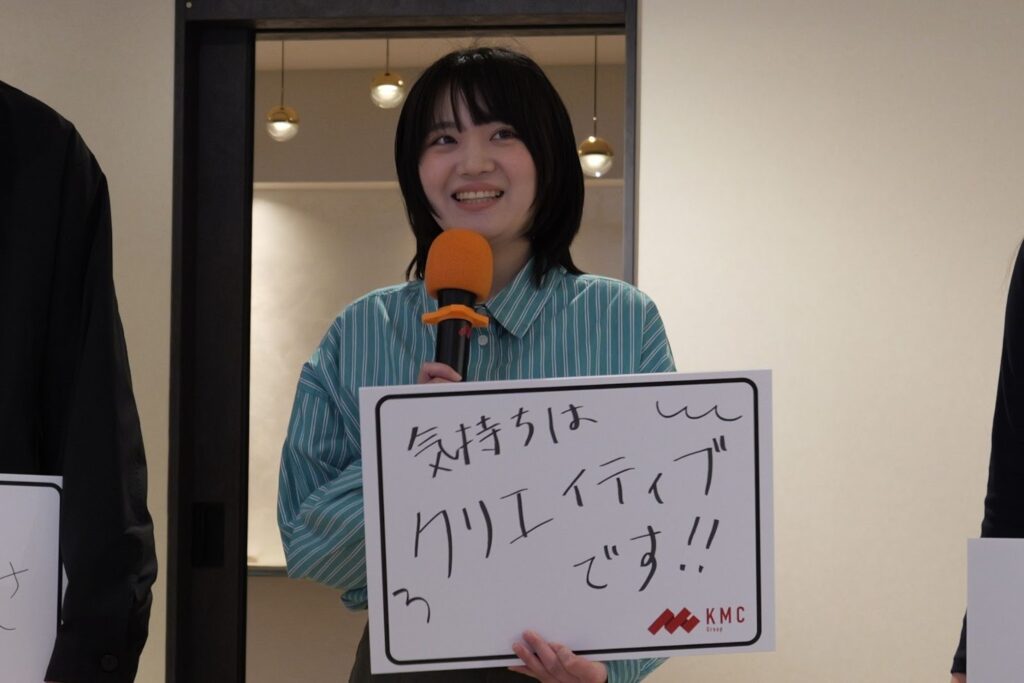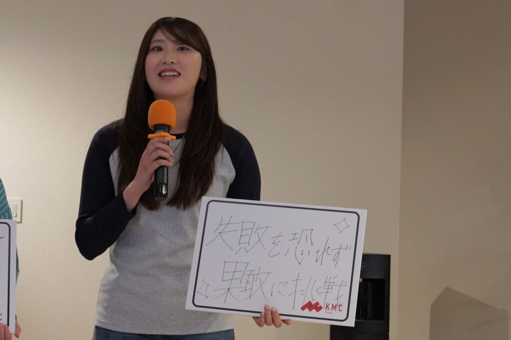 最後には「KMCに入社して楽しみなこと」として、「失敗を恐れず果敢に挑戦」など新しい出会いや大きな業務への挑戦、多様な価値観に触れることへの期待が語られ、3人の真っ直ぐな想いが伝わる時間となりました。